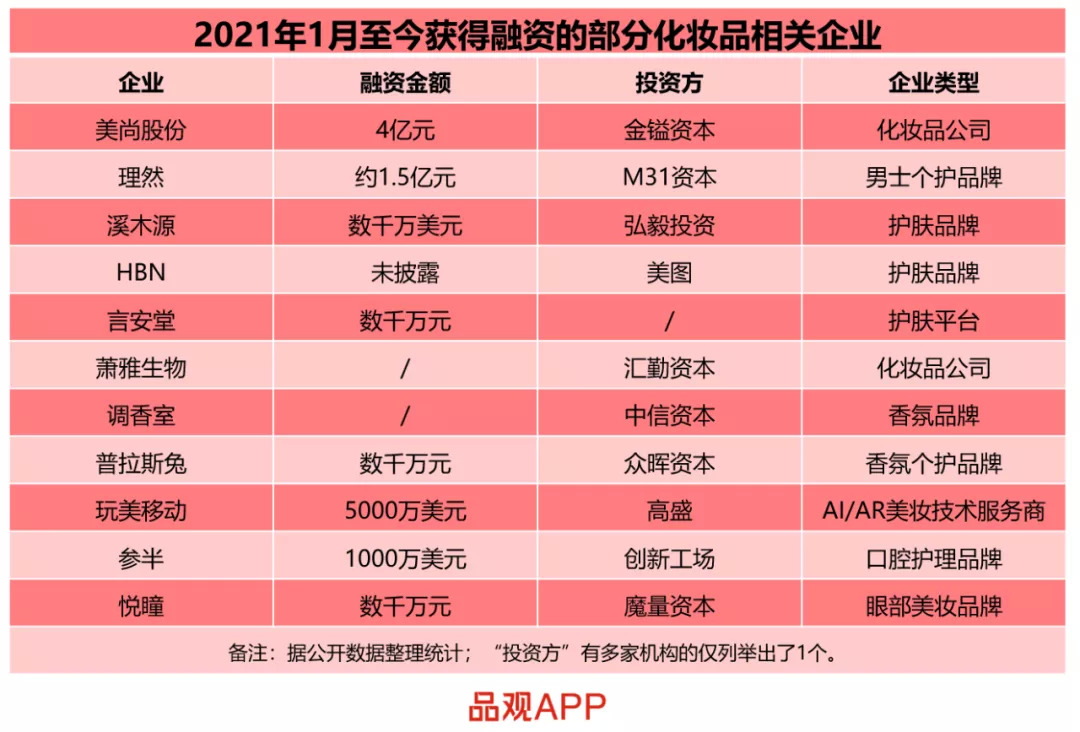 今年,这一火热局势正在延续,并大有超越之势。进入2021年至今,便有Colorkey、溪木源、美尚股份等近20家化妆品相关企业获得投资。其中,美尚股份融资高达4亿元。