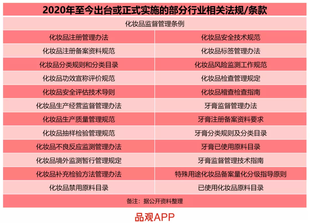 据品观APP不完全统计,2020年至今,除行业“最高法”《化妆品监督管理条例》外,至少还有20部以上关乎行业的“新政”陆续发布。