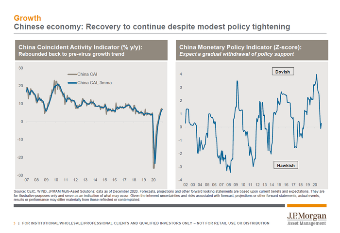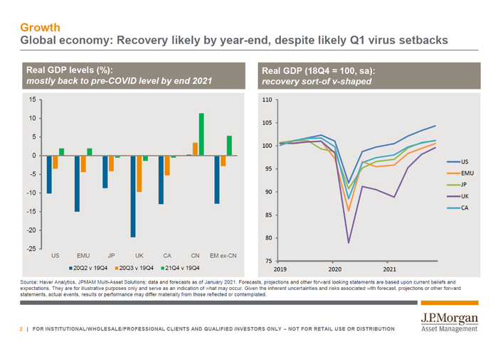 以下图来说明我们对今年GDP的预期。右边这张图,类似于V型,但不完全是V型。我们预计经济重新开放后,最初快速的增长速度将明显放缓。今年初,部分经济体(特别是欧洲)正出现一些经济发展放缓的迹象,但这些问题下半年应该会得到解决,因为越来越多的人会打疫苗,经济将重启。