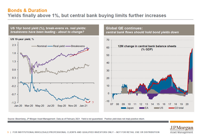 这显然是央行所希望的。他们希望全球经济或美国保持较低的实际资金成本。这对市场也产生了多种影响。我认为,这是股票市场对债券收益率上升不怎么担心的原因之一,因为迄今为止,真正的融资成本实际上未发生变化。我们认为,债券收益率将上升,但上升幅度将非常有限,从右图可以看到,央行大量买进政府债券和其他资产。我们应当保持警醒,央行的经济刺激规模非常巨大。在过去的12个月里,G3国家的央行购买的政府债券和其他资产占GDP的比重达到了60%。这种刺激政策会逐步减弱,不过速度会非常非常缓慢。