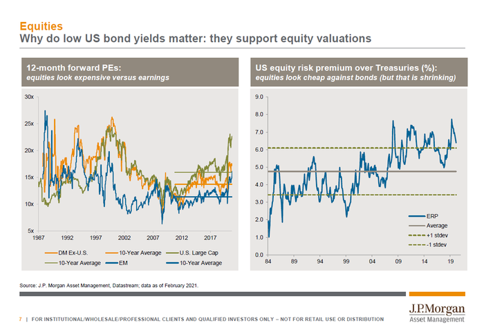 过去一年里,我们都没有谈到这个问题。股票相对于政府债券而言非常便宜。实际上,这条线在往下走,现在正接近自全球金融危机以来股票估值相对于固定收益、股票风险溢价所处的区间。因此,当前美国10年期国债收益率上升30或40基点,会使股票市场达到金融危机后平均相对估值水平。所以,股票估值仍然很低。但不会再像以前那么低。因此,低债券收益率对于支持股票估值而言非常重要。