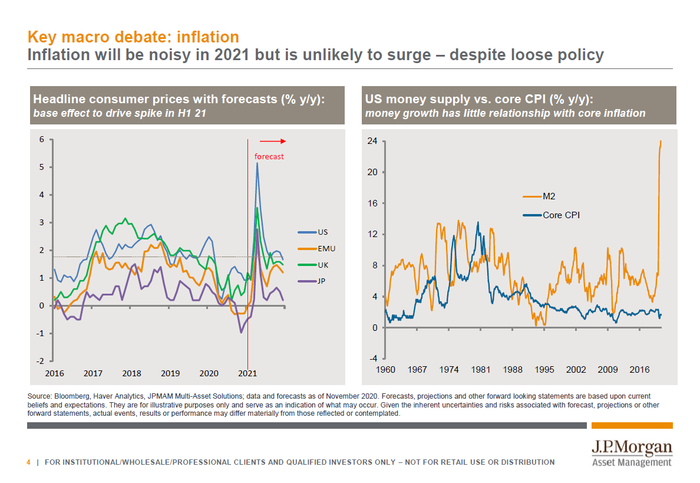 第三,对投资者而言,通胀是一个大问题。如果通胀飙升,将会成为市场的绊脚石。我们认为这是一个长期问题,过去几年遏制通胀的许多趋势(如人口结构和储蓄)可能会逆转,但今年还不用担心这个问题。今年的通胀数据波动会比较大,部分原因是基数效应,但目前我们不认为这是一个根本问题,各经济体中仍存在大量的疲软现象。