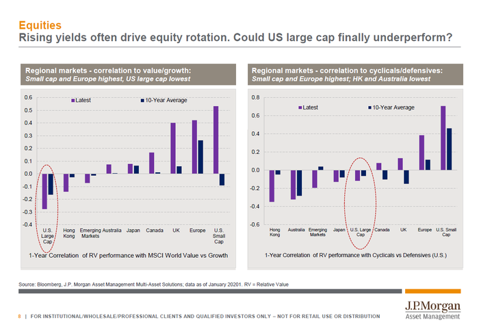 作为从业者,我们非常关心该投资哪些国家和地区的股票市场。很明显,美国股票市场是金融危机爆发以来的大赢家。美国股票市场的表现优于世界上其他任何市场。债券收益率上升往往会推动股票市场结构的变化,即股票市场的轮动。大家都喜欢谈论从成长股到价值股的轮动问题。