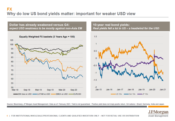 第六,美元将持续疲软,继续其下行趋势。在全球同步复苏的时期,美元受挫,且美国的实际利率保持低位。然而,美元相对于欧元、日元和G10国家货币已经贬值很多,未来可能更多是对新兴市场货币贬值,尤其是那些真正需要发展的地区,如拉美、欧洲和非洲的新兴市场货币,而非亚洲新兴市场货币或人民币。