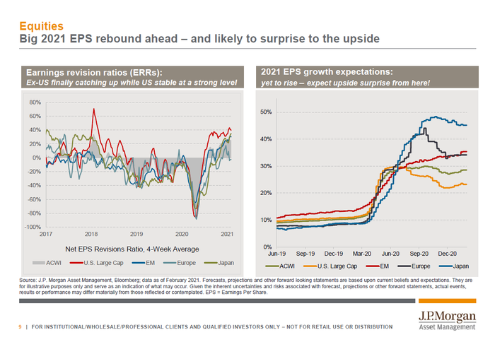 如果把股票作为一个整体资产类别来看。今年推动股市向好的因素是,全球企业利润出现超大幅度反弹。如右图所示,是目前普遍预测的今年全球利润的表现情况。其中,绿线是全球指数,在受疫情打击非常严重的地区,今年的收益将增长约30%。欧洲和日本增长可能在40%至50%之间。左图是分析师们调高或调低预测的情况。调高预测的分析师比率正在强劲上升。所以,我们认为,那些增长数据很可能仍然过低。对投资者而言,很可能还会有巨大惊喜,企业盈利增长数字反弹可能更加强劲。对股票而言是一大利好因素。