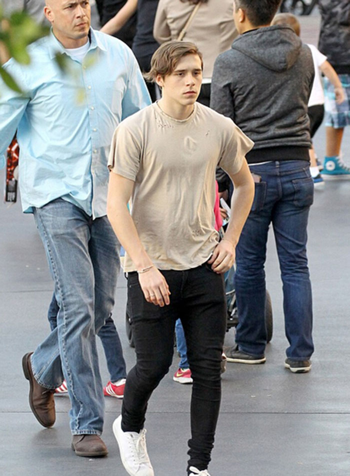 布鲁克林身穿一件米黄色的上衣和一条黑色紧身牛仔裤,装扮十分有型。他还将自己上衣的袖子挽了上去,显得更加时尚。