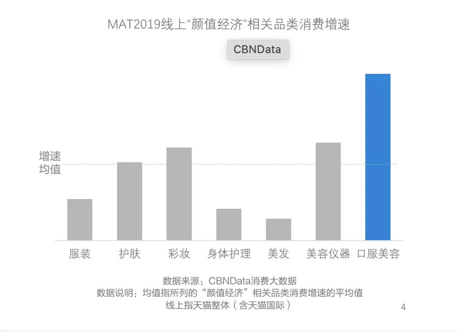 根据CBNdata数据显示,2019年线上“颜值经济”相关品类消费增速远高于线上各个品类的平均增速。