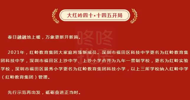 据楼市大事报道,2月23日,红岭中学官方公众号发布消息,科技中学、上沙中学+上沙小学合并、景秀小学,三所学校纳入红岭教育集团管理,并进行了更名!