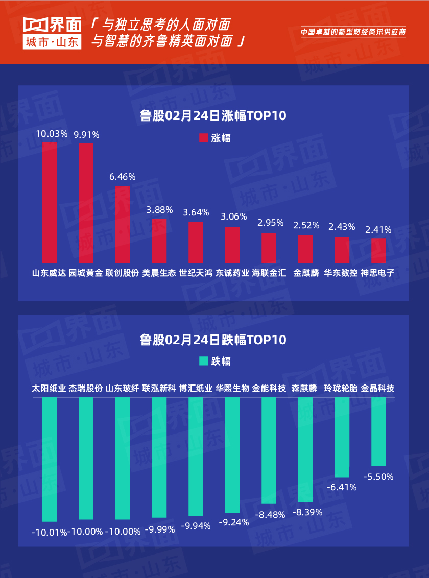 2月24日,山东省内沪深股票有88只个股上涨,133只个股下跌;总市值过千亿的有万华化学(600309)、海尔智家(600690)、潍柴动力(000338)、青岛啤酒(600600)、歌尔股份(002241)、中航沈飞(600760)、山东黄金(600547)共7家,500亿-1000亿的共有6家,分别是中泰证券(600918)、华熙生物(688363)、英科医疗(300677)、华鲁恒升(600426)、玲珑轮胎(601966)、南山铝业(600219)、太阳纸业(002078)。