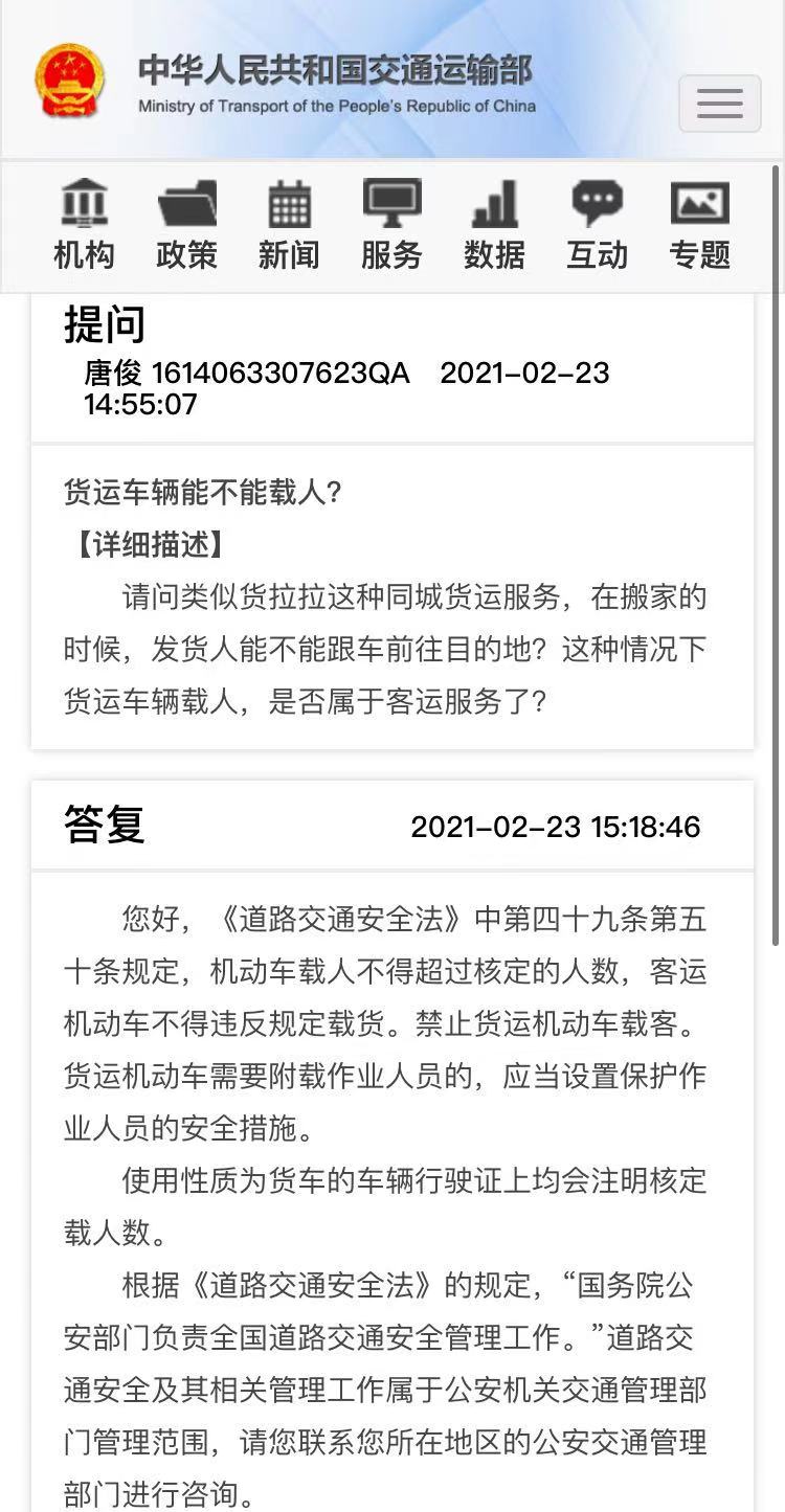 界面新闻记者就此问题,以公众身份在交通运输部网站留言咨询。交通部答复:《道路交通安全法》规定,禁止货运机动车载客;货运机动车需要附载作业人员的,应当设置保护作业人员的安全措施。