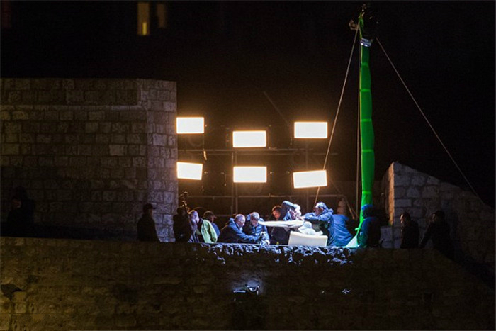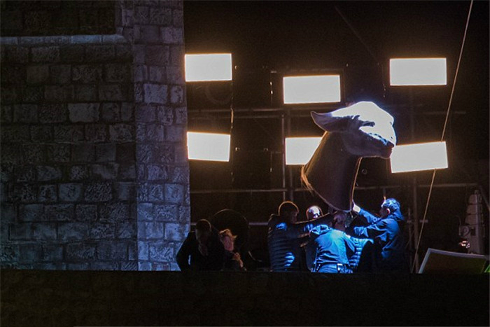 太阳下山后,工作人员将一个猫型头套升到屏幕前方