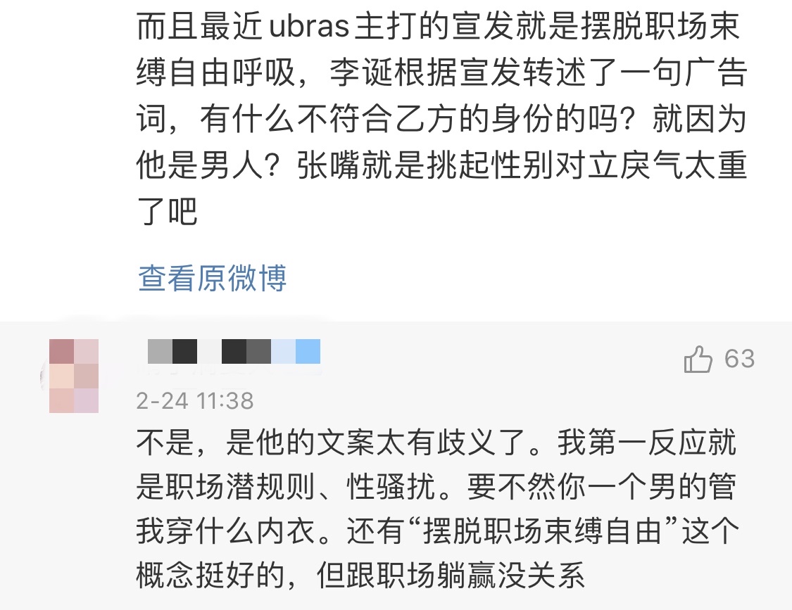 “男人穿什么女性内衣?”“解释一下女性怎么就躺赢职场了?”“广告词恶意太大,不想要女性客户了?”愤怒抗议的评论迅速攻占了李诞本人和品牌方的微博。