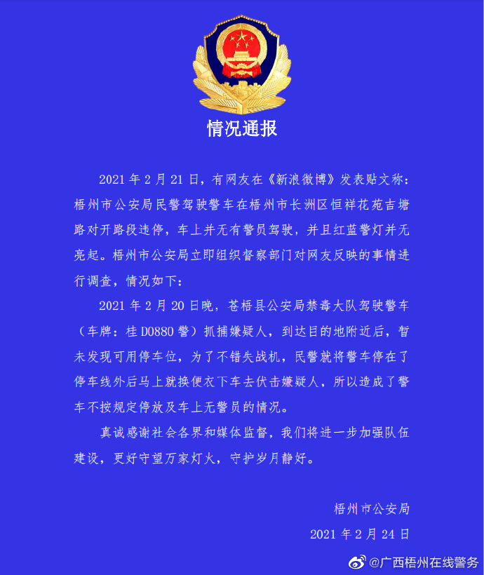 2021年2月20日晚,苍梧县公安局禁毒大队驾驶警车(车牌:桂D0880警)抓捕嫌疑人,到达目的地附近后,暂未发现可用停车位,为了不错失战机,民警就将警车停在了停车线外后马上就换便衣下车去伏击嫌疑人,所以造成了警车不按规定停放及车上无警员的情况。