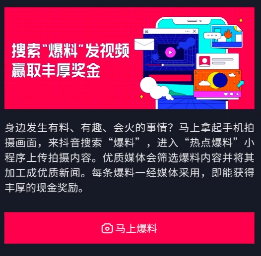 只需要用户拿起手机拍摄画面,在抖音搜索“爆料”,进入“热点爆料”小程序进行拍摄内容上传,随后便有优质媒体会进行筛选将其制作加工成优质新闻。而且每条爆料一经媒体采用,既能获得丰厚的现金奖励。
