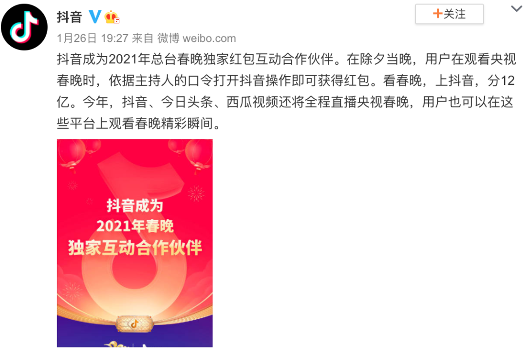 紧接着在抖音“补位”央视春晚的消费确认后,再到央视官宣抖音成为2021总台春晚独家互动合作伙伴,这场春节营销大战里,抖音和它的“抖音支付”被拎到了C位,而大年三十这一晚,抖音也在春晚直播的时候准备了12亿的红包豪礼。