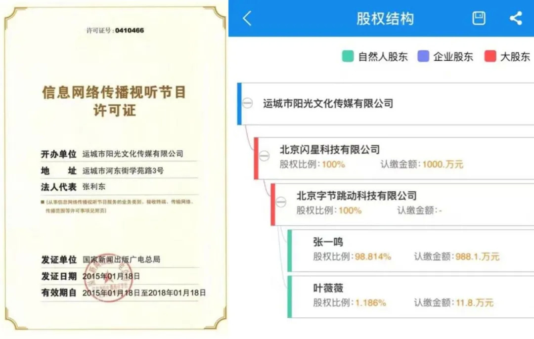 这一情况一如2016至2017年净网行动时期,有关部门收紧了《信息网络传播视听节目许可证》的发放。这一年新浪微博、梨视频、ACFUN等都因缺失这一牌照被勒令整顿,今日头条也在整顿行列。同年,今日头条收购山西运城阳光宽频,获得一张视听节目牌照。如果当初没有这张牌照,西瓜视频、火山小视频等字节旗下视频应用都会像内涵段子一样被关停,抖音也不会走到现在的皇族位置。