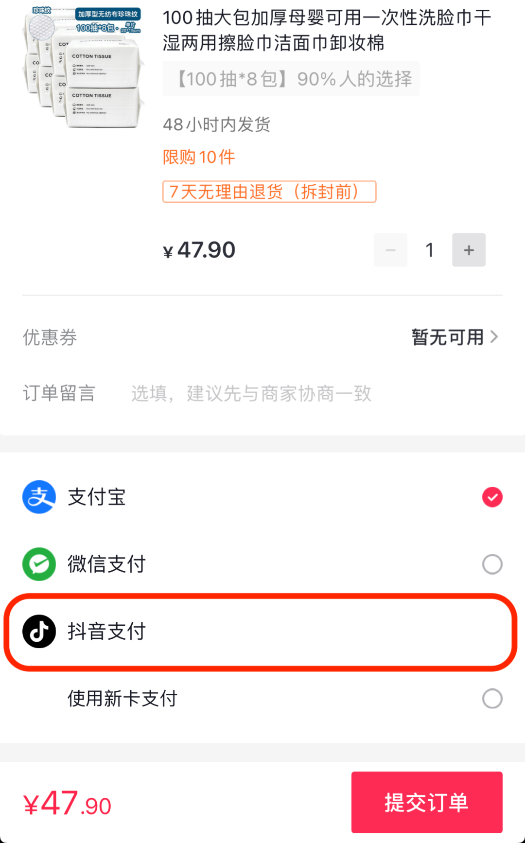 抖音商城内可以选择“抖音支付”方式