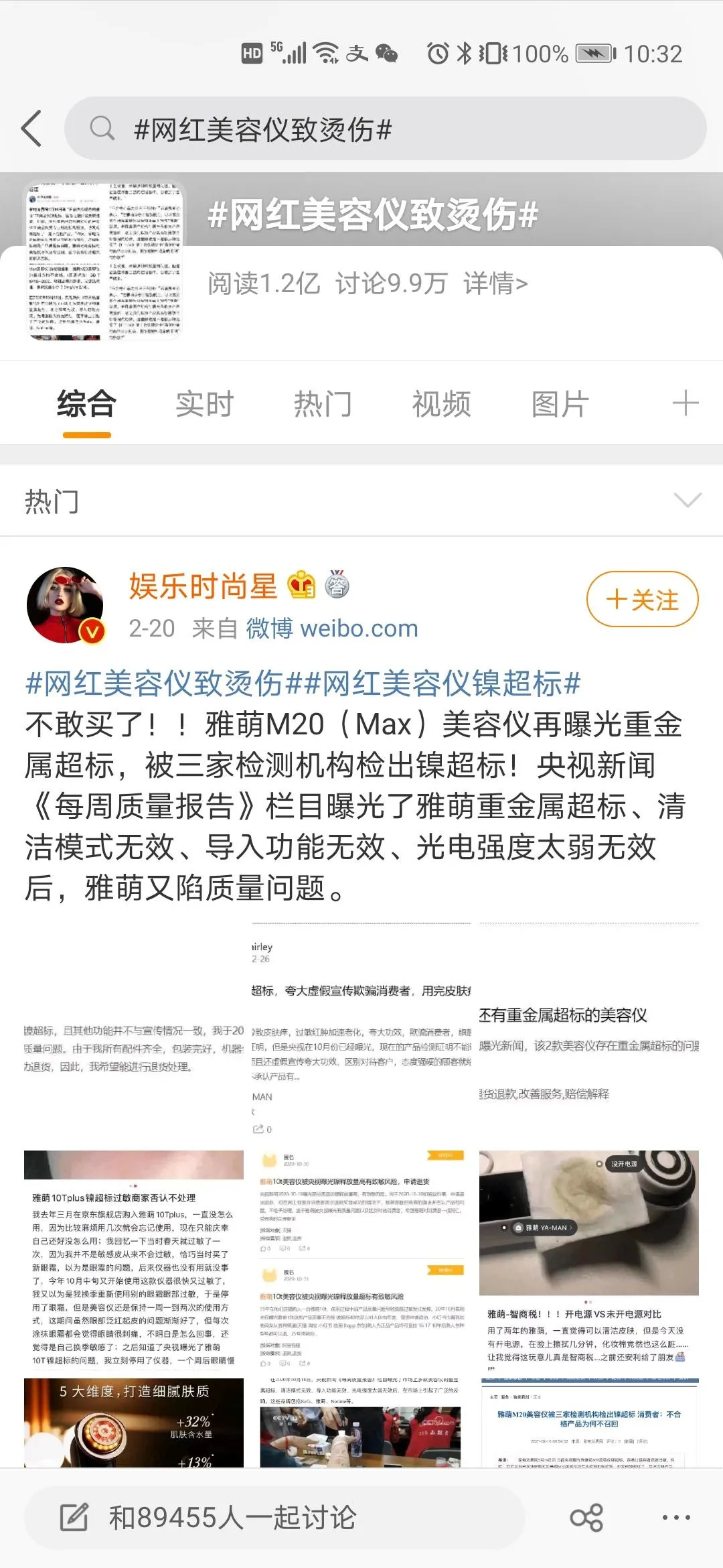 去年10月,央视新闻频道《每周质量报告》针对市场上10款美容仪进行测评,测评结果显示,市场热销的包括Refa、雅萌Yaman、Notime等6款美容仪存在诸多问题,其中包括美容仪与皮肤接触部分的重金属镍释放量超标、导入导出功能无明显效果、皮肤清洁效果不如手洗、LED光电功能无效等。该新闻报道播出后随即引发巨大关注,微博话题冲上热门,阅读量近8000万。