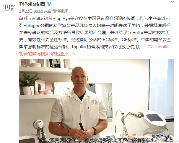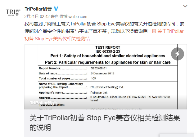 2月21日,TriPollar初普在其官方微博发布《关于TriPollar初普 Stop Eye美容仪相关检测结果的说明》回应,表示其IEC安全性报告最大测得温升效果为1.3K,对相应温升检测样品、方法和结果表示质疑。2月22日,TriPollar初普又发微博,特意请来以色列生产商解释说明相关未经确认的样品及方法所导致结果的不合理。