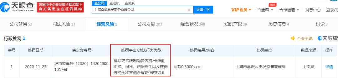 另据天眼查App显示,TriPollar初普的关联公司为上海奋博电子商务有限公司,成立于2012年9月。司法风险显示,该公司此前有数条案件纠纷,案由涉及网络购物合同纠纷、网络侵权责任纠纷和服务合同纠纷等。2020年11月23日还曾因排除或者限制消费者提出修理、更换、退货、赔偿损失以及获得违约金和其他合理赔偿的权利,被上海市嘉定区市场监督管理局罚款5000元。