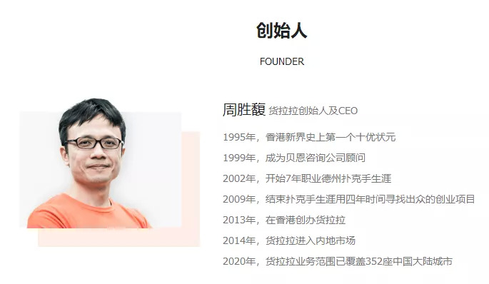 不过,当我们看到货拉拉创始人兼CEO周胜馥的履历时,就知道上面的论述,他肯定从未想过。周胜馥出生于广东揭阳,在香港长大,在学生时期他成绩优异,于1995 年成为香港新界区史上首个“十优会考状元”。1999 年,周胜馥毕业于斯坦福大学经济系,后进入管理咨询公司贝恩工作。2012年周胜馥开始寻找创业项目,适逢移动互联网创业浪潮兴起,周胜馥也投身其中,2013年创办货拉拉。
