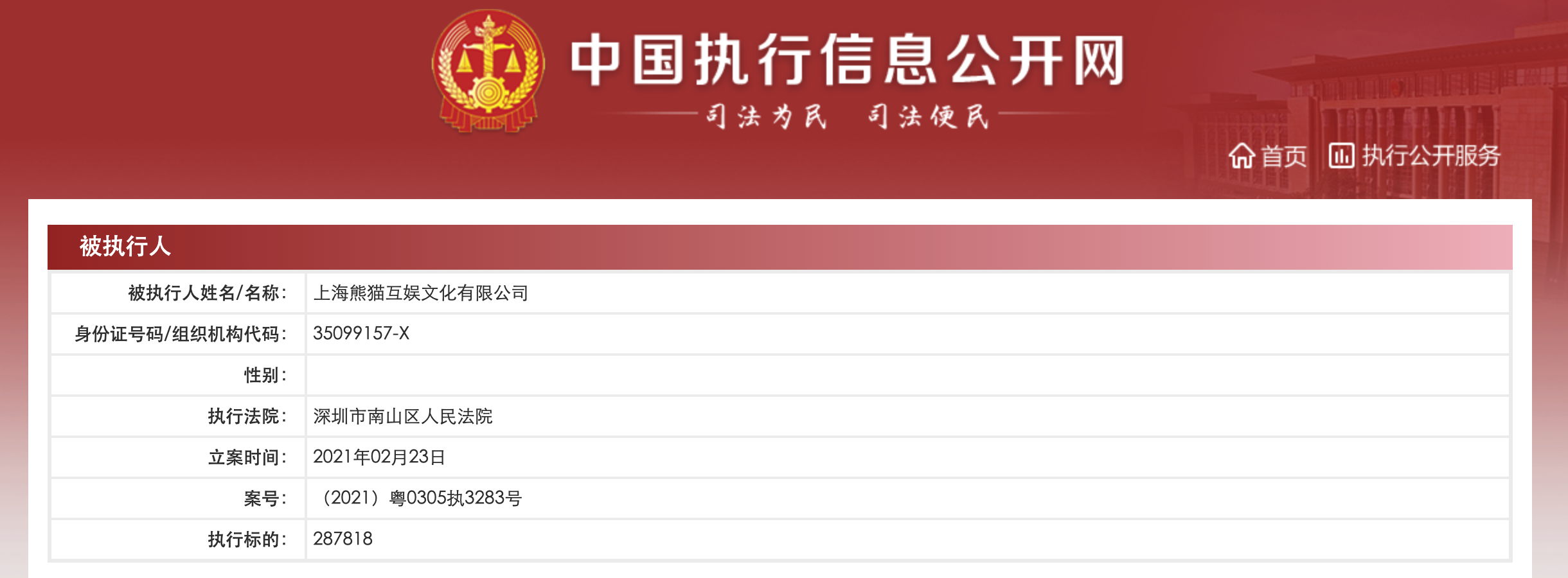 中国执行信息公开网2月25日消息,2月23日,上海熊猫互娱文化有限公司新增一条被执行人信息,执行法院为深圳市南山区人民法院,案号为(2021)粤0305执3283号,执行标的为287818元。
