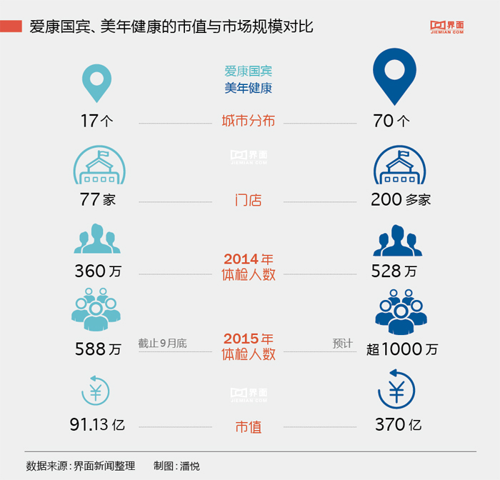 从市值及市场规模上来看,爱康国宾明显处于弱势。