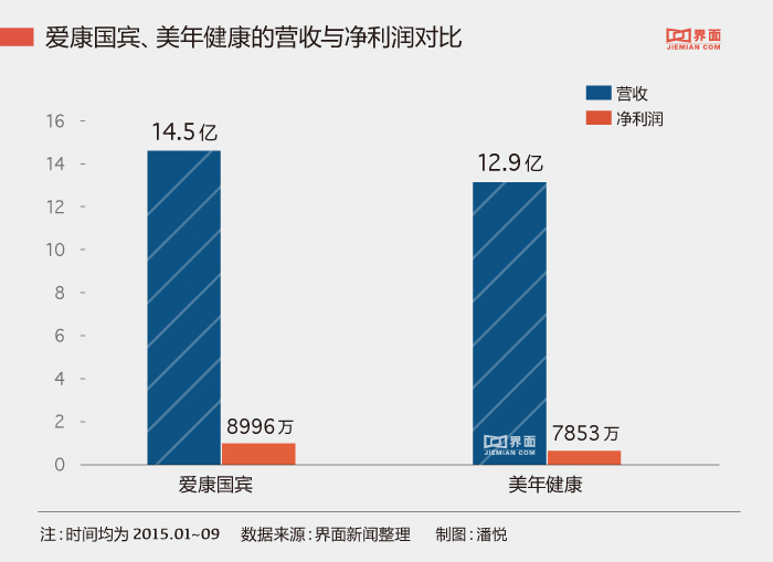 从营收及净利润上来看,爱康国宾的经营收入及盈利能力均比美年健康胜出许多。
