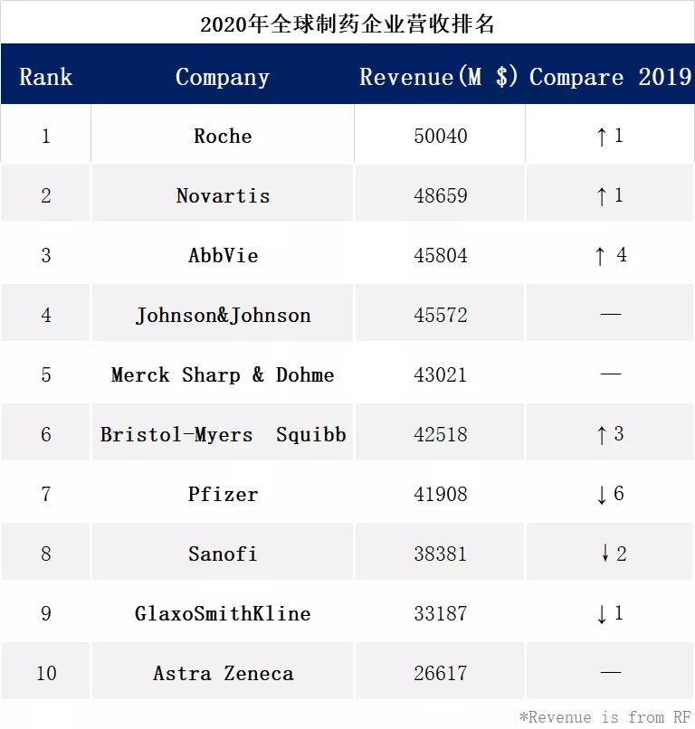 2020年,辉瑞因大手笔砍掉过期专利药Upjohn及消费者保健业务而在营收上大幅下滑,拱手让出多年占据的榜首地位,下滑6名至第7的位置。
