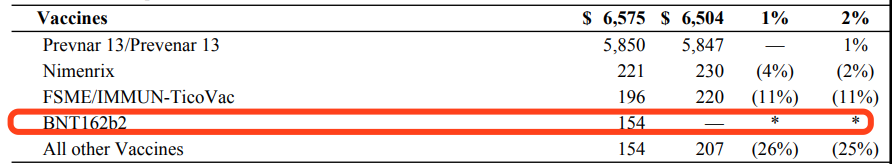 根据2020年报,辉瑞总营业收入为419.08亿美元,疫苗收入65.75亿美元,占比16%,Q4净利润为5.94亿美元,而去年同期为亏损3.37亿美元,BNT162b2四季度营收1.54亿美元。