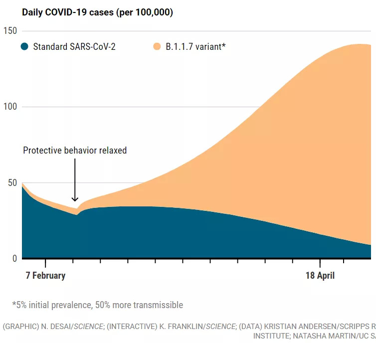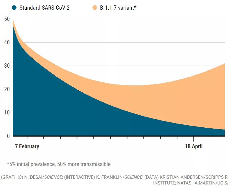 但传染性高出50%的变异毒株(比如英国发现的B.1.1.7变异毒株)会使得这种下降迅速逆转。新增确认量会再次上升。