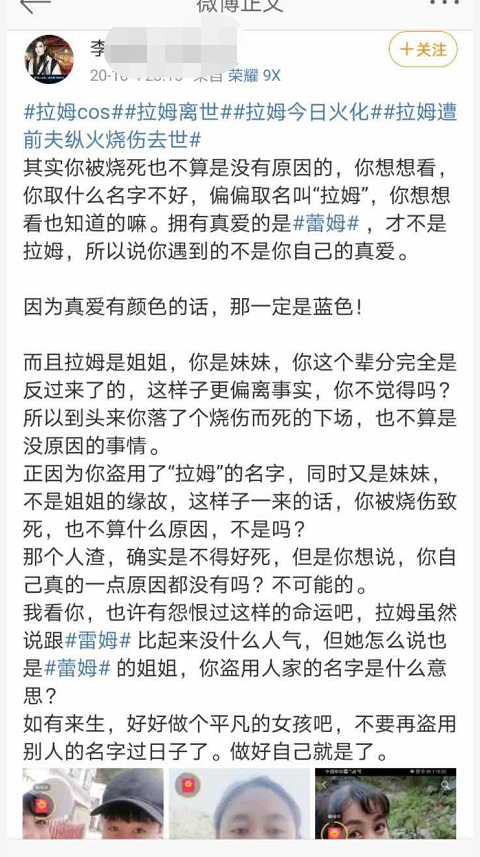 此外,有网民扒出涉事者曾发表言论称拉姆“被烧死也不算是没有原因的”。