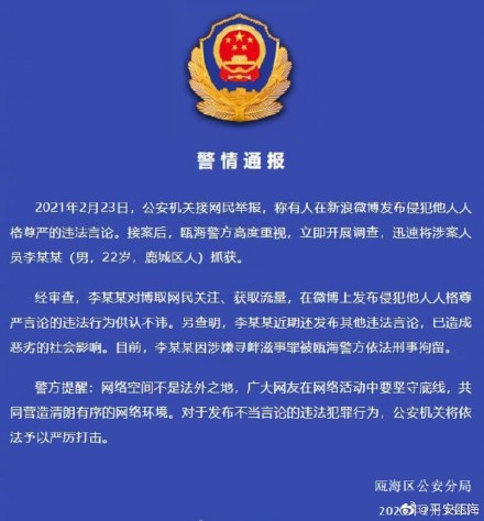 浙江省温州市公安局瓯海区分局官方微博2月25日发布警情通报:接网民举报称有人在新浪微博发布侵犯他人人格尊严的违法言论。警方迅速将涉案人员李某某抓获。