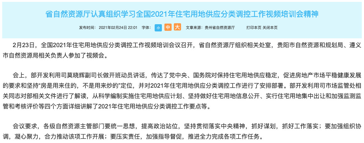 据贵州省自然资源厅发布的一则消息,2月23日,全国2021年住宅用地供应分类调控工作视频培训会议召开。会上,部开发利用司市场监管处相关同志对部相关文件进行了解读,其中一个要点是实行住宅用地集中出让。
