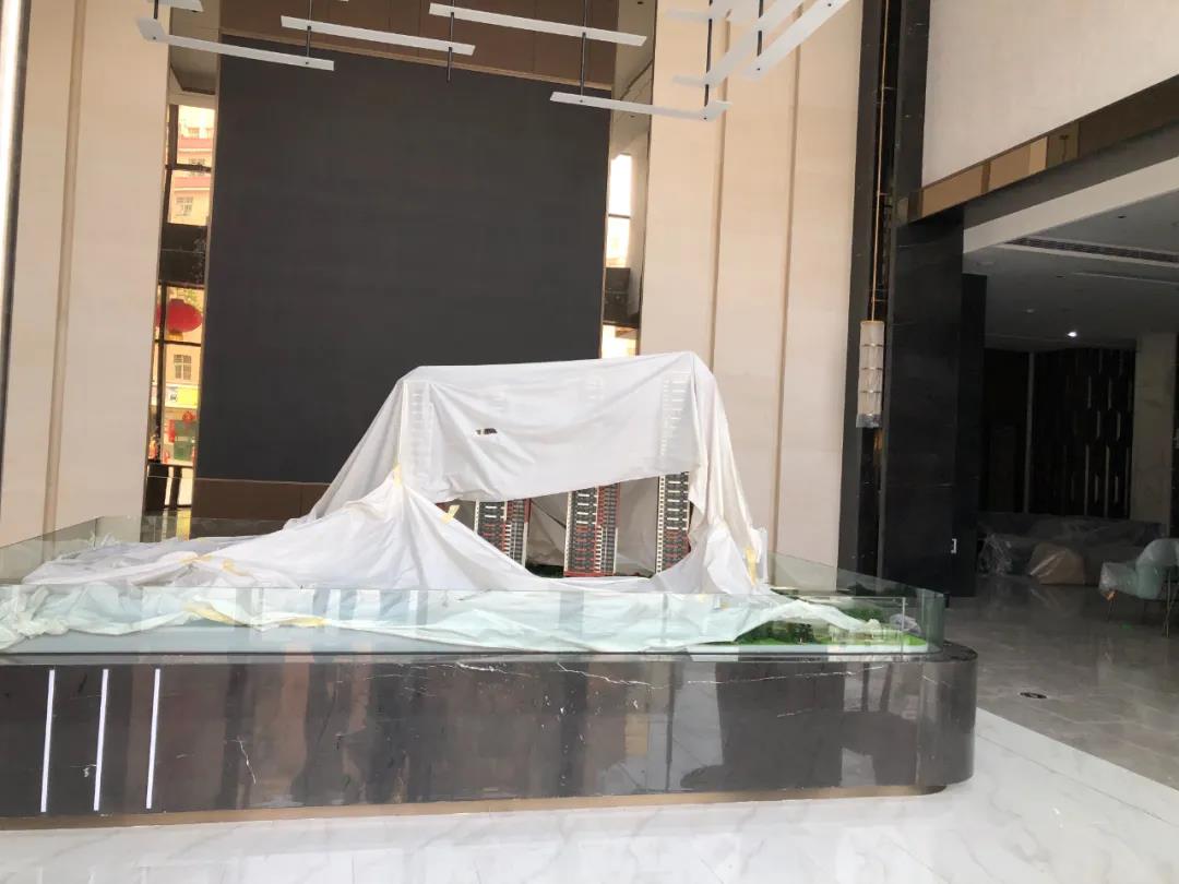 项目工地的围墙上贴上营销中心的广告,当我们抵达营销中心的大厅时,发现沙盘已准备好,但大厅内空无一人。