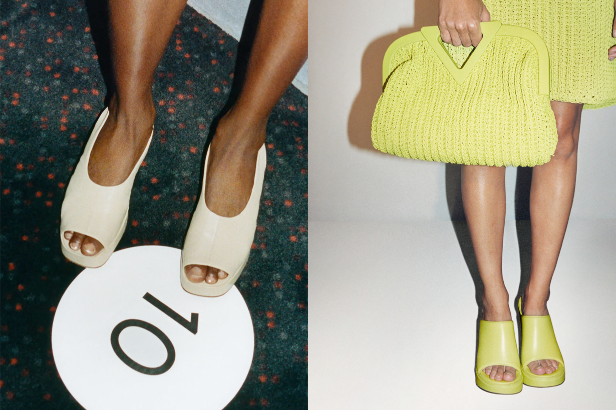 而在鞋履区这边大头马丁靴、绑带方头凉鞋以及透明水晶跟女巫鞋,也开始攻占社交平台。然而从泡面鞋到糖果色雨靴,从不缺少话题的葆蝶家鞋履系列,今春的主角应该是这款“塑胶鞋”。
