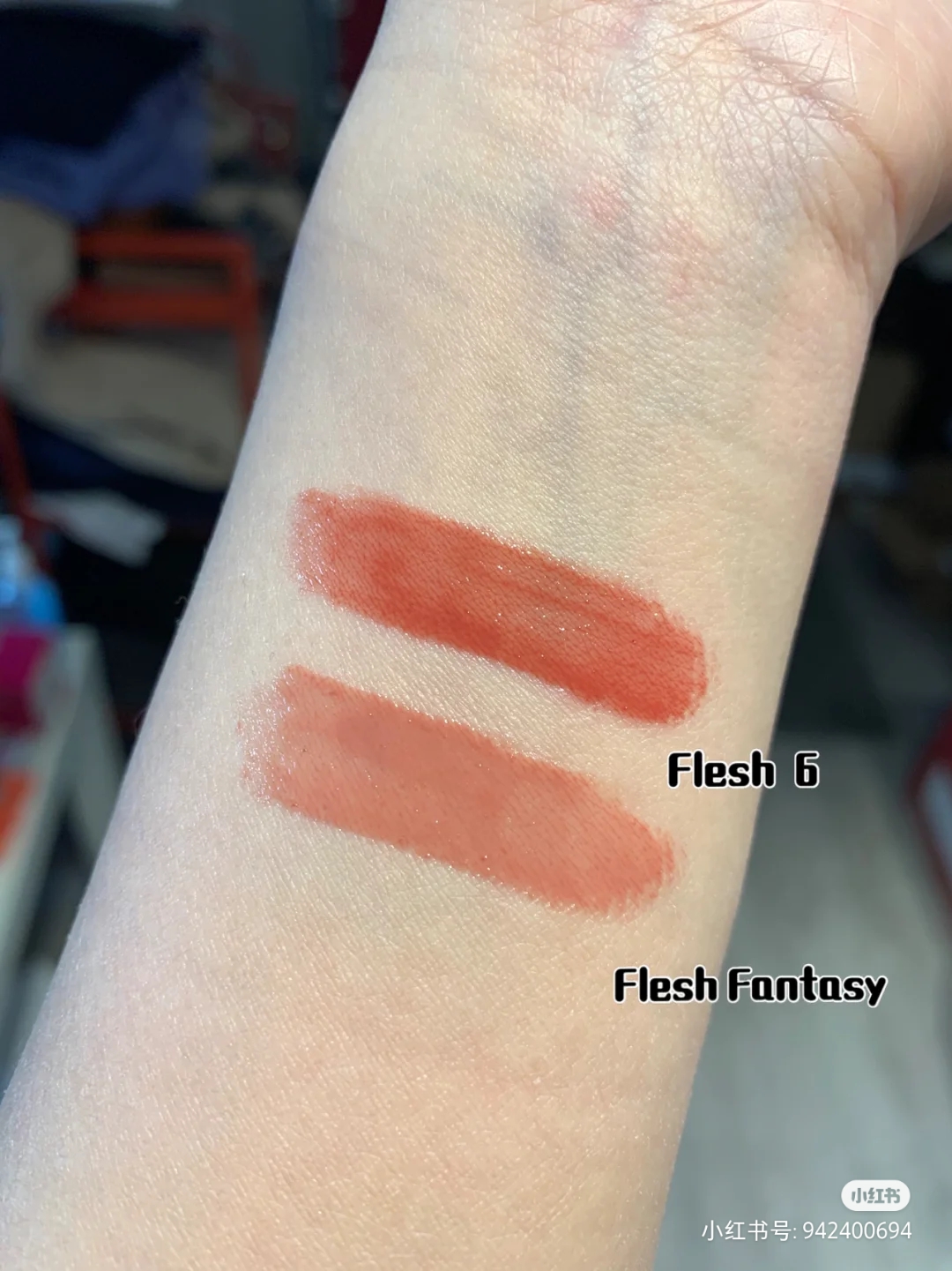 爱心唇釉含两种色号Flesh 6和Flesh Fantasy,两款色号偏裸色系,淡淡的豆沙蜜桃调,适合初春日常使用。唇釉的质地水润丝滑,不粘腻。