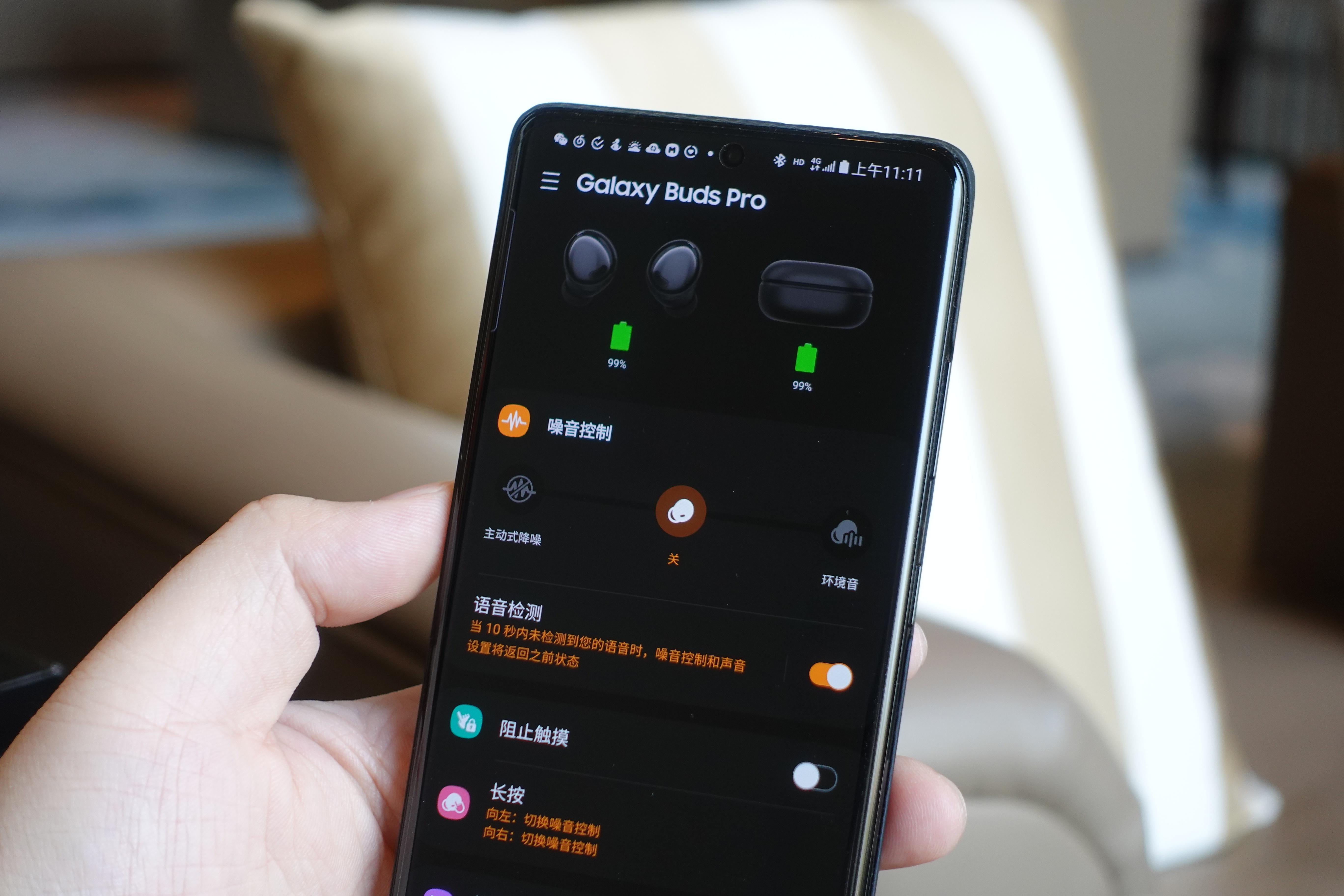 而到了Galaxy Buds Pro,其支持智能主动降噪(ANC)功能,还可以自主调节环境声设置,官方宣称可隔绝99%的背景噪声。