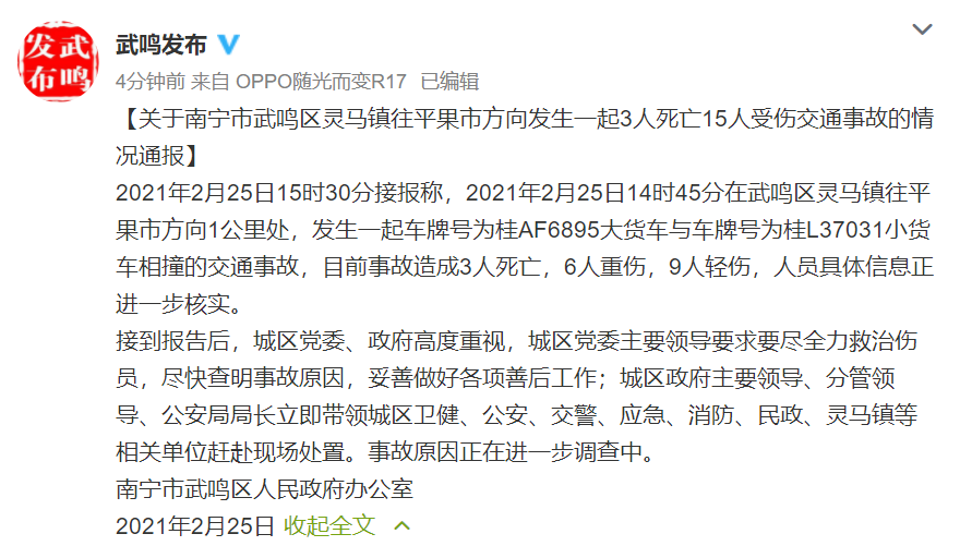 据@武鸣发布 微博消息,2021年2月25日15时30分接报称,2021年2月25日14时45分在南宁市武鸣区灵马镇往平果市方向1公里处,发生一起车牌号为桂AF***5大货车与车牌号为桂L3***1小货车相撞的交通事故,目前事故造成3人死亡,6人重伤,9人轻伤,人员具体信息正进一步核实。