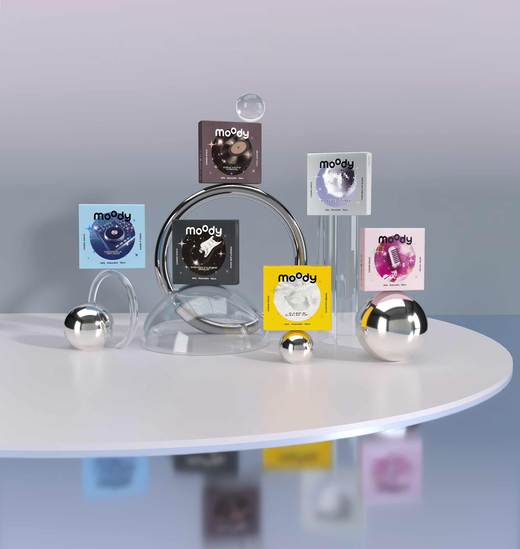 目前,moody售有太空迪斯科、he doesn’t know(他不知道)、少女白日梦三个10片装的日抛系列,以及灵感动物园、瞳趣咖啡馆两个2片装的季抛系列,还有蒸汽眼罩、隐形眼镜护理液等附属产品。单个系列的花色大致有5-9种,一盒售价在89元-119元不等。