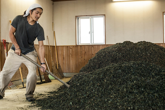 清晨8点,渡边健太开始了一天的工作。上午,他要从眼前堆得像小山一样的绿叶子里把茎秆挑出来;下午,他染完衣料,缝制完近期要交工的布制品,又去田里除了一会儿草。临近天黑,小伙子开着收割机忙活了一会儿,最后把第二天需要选别的绿叶子割好运回工作室。