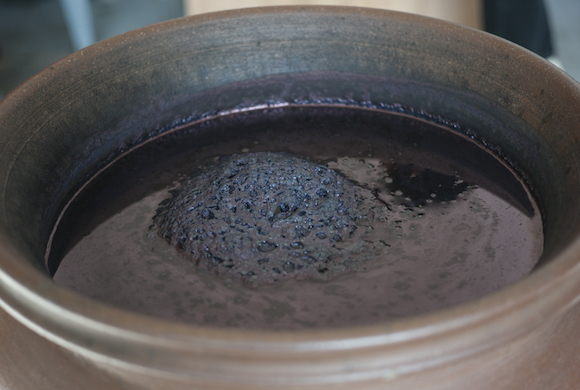 最后在发酵完成的染料里加入麦麸、木灰和氢氧化钙,