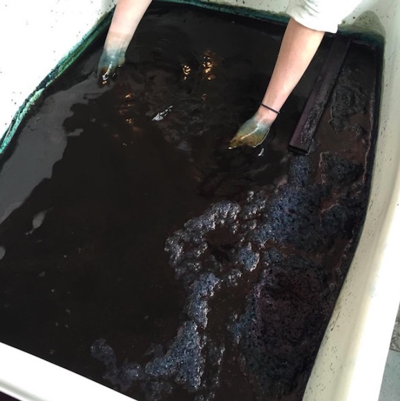 接着,将布料放入180厘米深的染缸。染料青里透黑:
