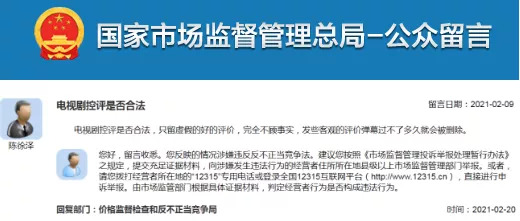 近日,有网友在国家市场监督管理总局官网上留言咨询:“电视剧控评是否合法?只留虚假的好的评价,完全不顾事实,发些客观的评价弹幕过不了多久就会被删除。”2月20日,官方给予回应,“控评”涉嫌违反《反不正当竞争法》,可提交充足证据材料,向县级以上市场监督管理部门举报,也可直接拨打12315或登录12315互联网平台,进行申诉举报。