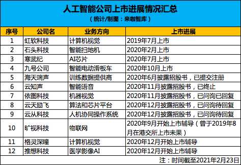 今年,也被业内称为是AI企业上市的大年。除了此前已经上市的虹软科技、石头科技、寒武纪以及九号公司外,据来咖智库初步统计,从去年下半年开始,除了云知声外,还有海天瑞声、依图科技、云天励飞、云从科技等多家AI企业,都相继披露招股书冲刺科创板。目前海天瑞声已进入提交注册阶段,依图科技则已对外披露了第一轮问询回复,云天励飞和云从科技也均已进入问询状态。而港股上市未果的旷视科技,以及格灵深瞳、推想科技,则都在去年开始进入上市辅导阶段,估计今年会陆续递交招股书。