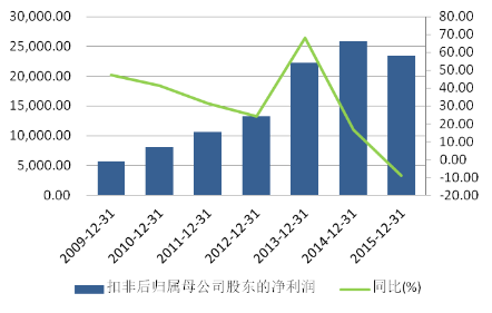 在扣除非经常性损益之后,公司2015年的业绩绝对值甚至出现了上市以来首次下降的情况,而且同比增长率上市以来首次出现负增长。