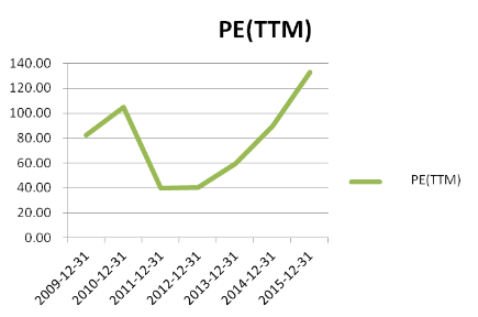 即使机器人上市以来业绩增速持续下滑,但二级市场对其的追捧却未见褪色。根据Wind数据库统计显示,公司PE(TTM)在2011年降到最低之后,便开始拐头向上持续提高,从39.80倍上涨到132.70倍;而同期营业收入和净利润的同比增速却出现持续下滑,分别从2011年末的41.91%、47.97%下滑到2015年末的10.62%以及21.23%。