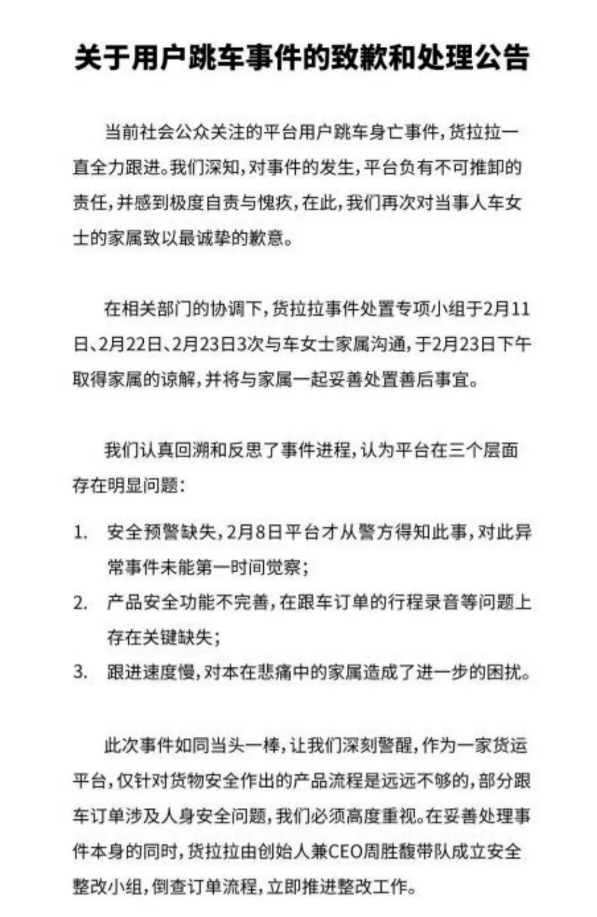 2021年2月24日,货拉拉官方微博就用户跳车致死事件致歉,发布处理公告,并附上安全整改小组成员。在公告中,货拉拉承认在三个层面存在明显问题,包括安全预警缺失、产品安全功能不完善、跟进速度慢等。