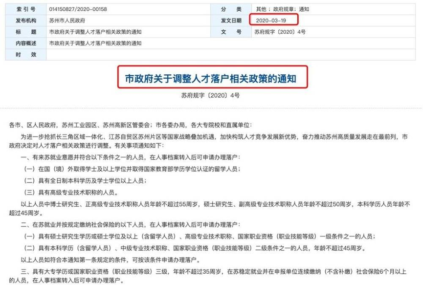 在人才方面,2020年3月19日,苏州市发布了《市政府关于调整人才落户相关政策的通知》,极大地放宽了对本科生以及大专学历人才的落户限制。对苏州这种规模的城市来说,专科和本科学历即可轻松落户的政策,在当时不可谓不宽松。