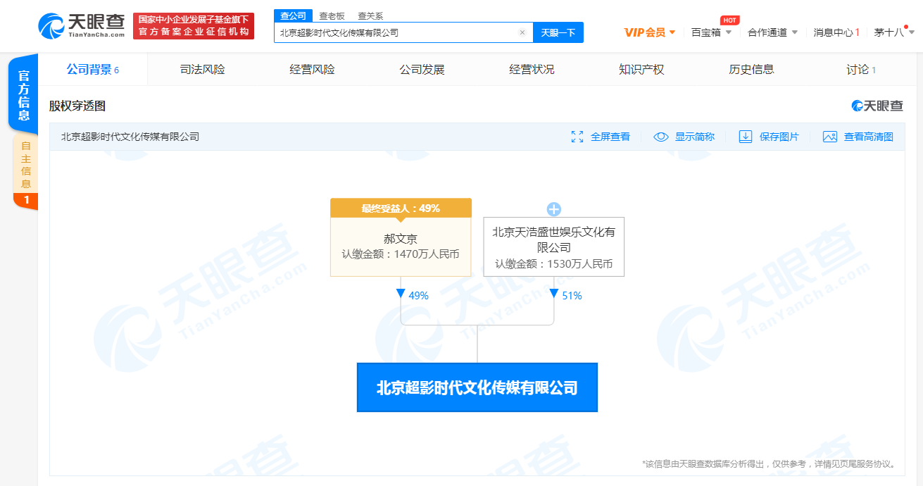 北京超影时代文化传媒有限公司成立于2020年9月,注册资本3000万人民币,法定代表人为郝文京,经营范围包括经济贸易咨询,舞台灯光音响设计;影视策划;广播电视节目制作;演出经纪;电影发行等。股东信息显示,北京天浩盛世娱乐文化有限公司成为该公司第一大股东,持股比例51%。